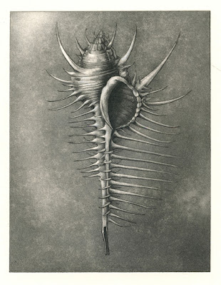 The Spiny Murex is an amazing delicate creature. The specimen I worked from was about 5 inches long with crazy sharp spikes. It looks so delicate upon first inspection but this little critter protects itself really well from predators. It was a challenge to draw. This offering is for a Solar Etching which is hand-pulled in black archival ink.